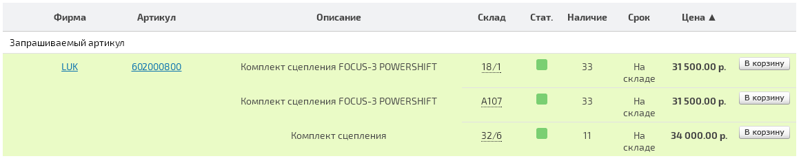 Результаты поиска — номер павильона (склад), цена, наличие